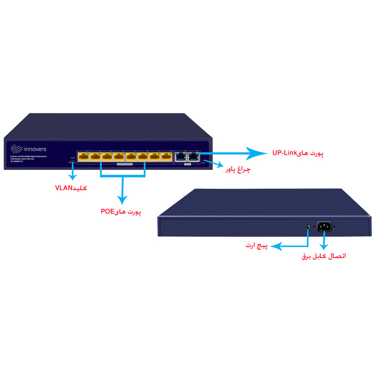 سوییچ ۸ پورت گیگابیت PoE+ اینوورس IN‑1008GP‑2T – توان کل ۱۲۰ وات